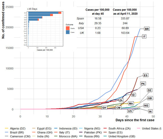 The number of cases in the first 45 days of COVID-19 arrival to selected countries (inside and outside Africa). Inset: bar plot showing cases per 100,000 population at day 45. Comparison of cases per 100,000 on day 45 and on 11 April 2020 (around a month later).