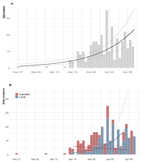 Epidemic curve of the confirmed cases of COVID-19 and the exponential growth fitting. (A) For all daily new cases, (B) disaggregated cases per transmission route as local or imported. The thick line represents the estimate surrounded by the 95% confidence interval (dashed lines).