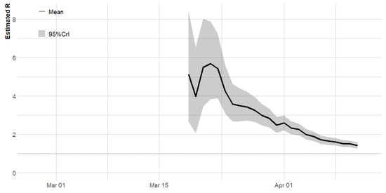 The estimated reproduction number increased rapidly from a median of 4.98 (95% CrI: 2.65–8.41) at day 22 (19 March 2020), reaching a maximum value of 5.61 (95% CrI: 3.83–7.88) at day 25 (22 March 2020). The value of R decreased steadily after 20 March 2020, the day international travel ban was placed on 15 countries though it is still above the pandemic threshold of 1. The median R over the study period was 2.71, and the latest value on 11 April was 1.42 (95% CrI: 1.26–1.58).