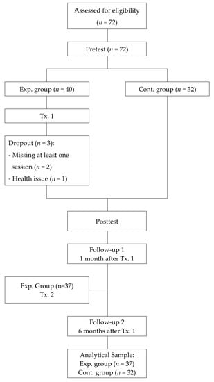 The sample size required for this study was calculated using G*power 3.1 (Heinrich Heine University, Düsseldorf, Germany), in which the values of significance level, effect size, and power were 0.05, 0.30, and 0.80, respectively, for repeated-measures analysis of variance (repeated ANOVA). The result showed that this study would require at least 58 subjects; thus, a total of 72 individuals were recruited to account for potential dropout. In fact, three people in the experimental group were excluded: two for missing one of the four training sessions, and one due to a health issue. Thus, the final analytical sample comprised 69 subjects, 37 in the experimental group and 32 in the control group (Figure 1).