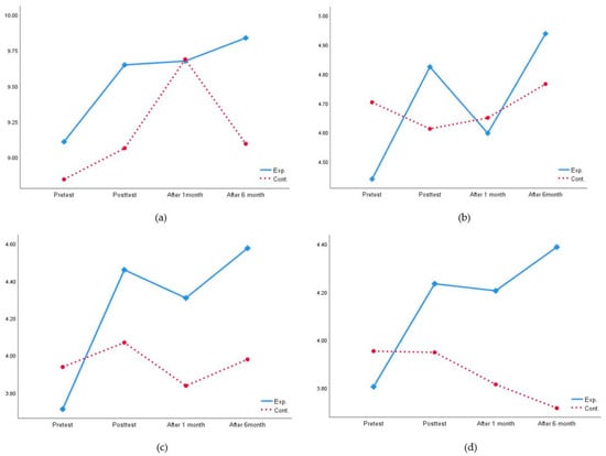 In addition, the mixed ANOVA results showed that there was a statistically significant main effect of time for social capital, Wilks’ lambda = 0.91, F(2.60, 174.30) = 3.17, p = 0.032, = 0.05 (Table 4). The degrees of freedom were corrected using the Huynh–Feldt estimates because of non-sphericity. Pairwise comparison results revealed a significant difference in the social capital scores between pretest and posttest (F(1, 67) = 6.08, p = 0.016, = 0.08), whereas no significant difference was found between posttest and 1-month follow-up (F(1, 67) = 1.66, p = 0.202, = 0.02) and between 1- and 6-month follow-ups (F(1, 67) = 0.64, p = 0.427, = 0.01). The social capital score was highest in the order of posttest (M = 4.09, SE = 0.06), 6-month follow-up (M = 4.05, SE = 0.04), 1-month follow-up (M = 4.01, SE = 0.05), and pretest (M = 3.88, SE = 0.08).