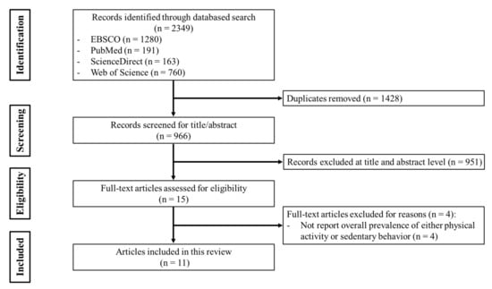 To achieve the research aims of this study, we adopted a unique literature-search protocol. First, to the authors’ knowledge, only 9 national monitoring and surveillance programs involved in PA behavior have been conducted in China: (1) Chinese Youth Risk Behavior Survey (CYRBS) []; (2) Physical Activity and Fitness in China—The Youth Study (PAFCTYS) []; (3) China Health and Nutrition Survey (CHNS) []; (4) Global School-Based Student Health Survey (GSHS) []; (5) National Physical Fitness and Health Surveillance (NPFHS) []; (6) Chinese Children Dietary Index (CCDI) []; (7) China Education Panel Survey Junior High Cohorts study (CEPS) []; (8) China’s Report Card [,]; and (9) Chinese City Children and Youth Physical Activity Study (CCCYPA) []. After confirming the projects, we used 4 electronic databases, namely, Web of Science, EBSCO, ScienceDirect, and PubMed, to search for published articles derived from those monitoring and surveillance programs. We searched for articles of which the title or abstract included either the full surveillance programs title or abbreviations. Figure 1 presents the flowchart of study selection of this systematic review according to the Preferred Reporting Items for Systematic Reviews and Meta-Analyses (PRISMA) statement. Following this search protocol, a total of 2349 references were retrieved: 1280 from EBSCO, 191 from PubMed, 163 from ScienceDirect, and 760 from Web of Science. After removing duplicates, 966 references remained. Of all the remaining references, we screened on the basis of the inclusion and exclusion criteria (Table 1). Finally, 11 papers from 6 systems (GSHS, CHNS, CYRBS, PAFCTYS, China’s Report Card, and CCCYPA) were included [,,,,,,,,,,]. The reference lists of 11 papers were also screened, which aimed to seek more eligible papers, but no more qualified papers were obtained. The literature search and study selection were independently performed by two authors (J.-T.H and X.-N.Y), and any inconsistency was resolved by a third author (S.-T.C).
