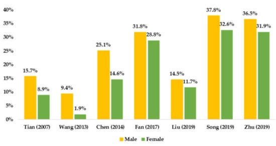 Summarized available prevalence of SB by sex among Chinese children and adolescents.