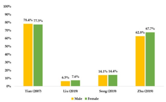 Using established cut-offs to determine PA and SB prevalence among Chinese children and adolescent, this study suggests that older children and adolescents have lower levels of PA, which is consistent with many previous studies [,,]. In addition, boys are more physically active than girls, which is supported by other studies [,,]. However, this review was unable to summarize SB patterns by sex and age among Chinese children and adolescents, indicating that more national studies on the prevalence of SB are needed.