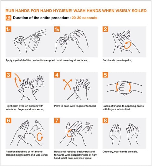Figure 5. How to Hand Rub? [From: WHO Patient safety. Hand Hygiene: Why, How & When? Revised August 2009 https://www.who.int/gpsc/5may/tools/workplace_reminders/en/ (Accessed on 24 March 2020)].