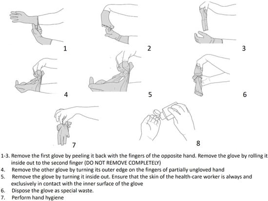 - After use, gloves should be removed using appropriate techniques to prevent hand contamination. Gloves should be removed by rolling from the wrist towards the fingers to avoid contact with skin. It is necessary to remove gloves by touching only the external part (Figure 6).