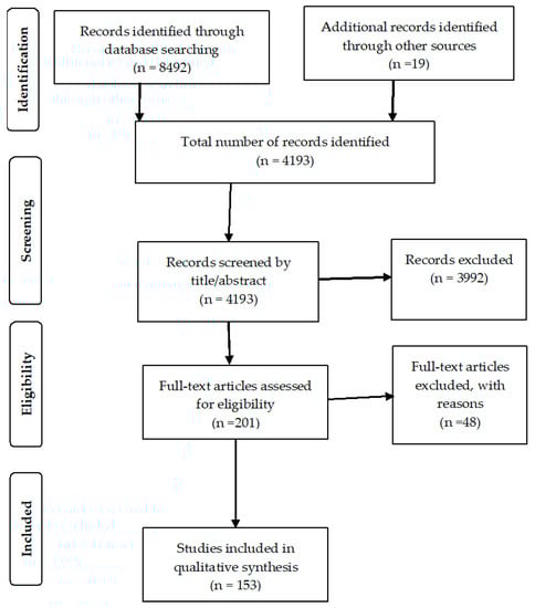 A total of 4193 unique articles were identified after excluding 4318 duplicates. Out of the remaining articles, 3992 were excluded because their abstracts and titles did not meet the eligibility requirements (Figure 1). From a full-text review of the remaining 201 articles a total of 153 were identified for the final review. The reasons for excluding 48 studies were that they had used non-spatial statistical methods (29 articles) or local or regional health survey data (18 articles), while one article was a systematic review (1 article).