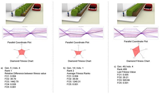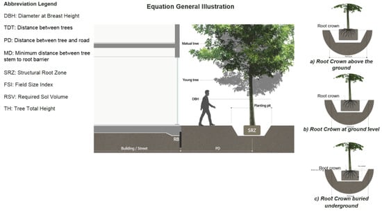 - The construction agent assigns equation logics to control different variables and defines the heuristic function as follows: (a) Equation (1) and Equation (7) control the distance between trees; (b) Equations (2) and (3) calculate the distance between the tree root crown and the street centerline depending on the tree type; (c) Equations (4)–(6) cluster the trees depending on the D/H of the neighborhood buildings and calculates the diameter at breast height; (d) Equation (8) calculate the SRZ needed for each tree type cluster in correspondence with the infrastructure or restriction defined by the user; (e) Equation (9) installs the RB at the minimum distance between the street and the tree stem; (f) Equation (10) calculates the soil volume needed for each tree cluster type defined by the previous equations as illustrated in Table 1.