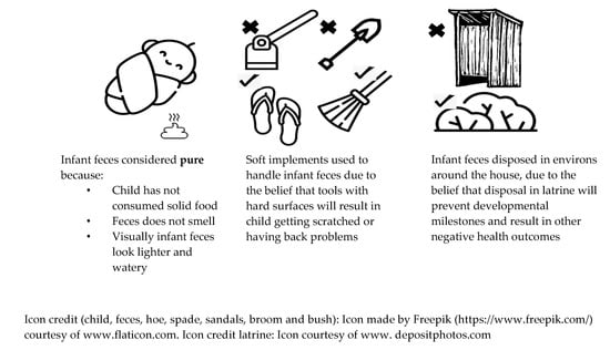 18]. Moreover, the safe disposal of stool of an infant under the age of six months—in a latrine—was described as impeding the development and adversely affecting the health of the child. Despite still being practiced, our respondents described these views and practices as outdated and changing.