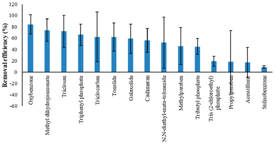 The average removal efficiencies of 15 out of 20 examined PCPs, for which three or more data points were available, are presented in Figure 1. The estimated statistics (mean and standard deviation of influent and effluent concentration, removal efficiency and rate) are given in Table S6 (Supplementary Materials).