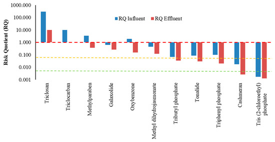 Environmental risk was evaluated for 11 PCPs for which the PNEC estimates were available in the literature. The PNEC value for a certain PCP is reported based on experimental and modeling studies related to Daphnia magna (e.g., references [25,28]), which was used to calculate RQ of that PCP in the influent and effluent water. PNEC values of selected PCPs show large variation in water. For example, the PNEC values of triclosan and triclocarban were below 0.5 μg L−1, which indicate the high toxicities of these compounds in the aqueous phase. On the other hand, the PNEC estimate of tris (2-chloroethyl) phosphate above 100 μg L−1 showed its comparatively lower toxicities in the aqueous phase [25] (Table 2).