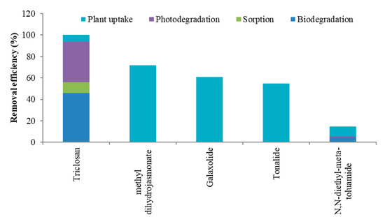 The available evidence suggests that the physicochemical properties of PCPs play a pivotal role in their removal processes in CWs (Table 3 and Table 4). For a few PCPs, experimental studies (e.g., hydroponic microcosms, media adsorption experiments, and CWs) were conducted to calculate the relative contribution of various mechanisms (Figure 3; Table S5, Supplementary Materials). The possible removal pathways of PCPs revealed by experimental studies are biodegradation (aerobic and anaerobic), plant uptake, adsorption, sorption, hydrolysis, volatilization, and photodegradation. Although for most of the PCPs more than one mechanism contributes to their removal, all the above mentioned removal pathways are not responsible for every PCP. Therefore, a compound specific examination is required for understanding each removal mechanism. Furthermore, it is noteworthy that environmental conditions in a certain type of CW (e.g., FWSCW, HFCW, and VFCW) are different in order to facilitate the specific removal mechanisms. For instance, HFCW and VFCW provide suitable conditions for the growth of microbial communities, which contribute to PCPs’ biodegradation, whereas, FWSCW enables the possibility of photodegradation of PCPs.