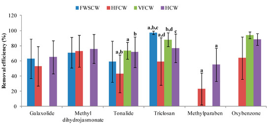 In this section, synthesis on six selected PCPs is presented, for which sufficient data (three or more data points) are available in two or more types of CWs for statistical comparison to choose the best possible design of CWs. Detailed discussion about the other nine PCPs is given in Table S9 (Supplementary Materials). The removal efficiency of 15 studied PCPs with four types of CWs (FWSCW, HFCW, VFCW, and HCW) is presented in Table S10 (Supplementary Materials). The results of one-way ANOVA and z-Test for comparison of means for six selected PCPs with different types of CWs are presented in Table S11 (Supplementary Materials).