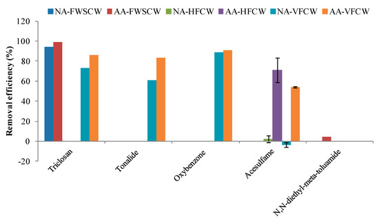 - The improvement in DO due to redox manipulation with AA enhances the removal efficiency of PCPs, which are better removed under aerobic conditions. Although anoxic bio-transformations are slower than the oxic ones, the high performance of AA-CWs could be due to the occurrence of various micro-environments (aerobic and anaerobic) and subsequent contribution of both aerobic and anaerobic metabolic pathways in the removal of PCPs. This is evident by the enhanced removal efficiency in the case of AA-FWSCW (triclosan), AA-HFCW (acesulfame), and AA-VFCW (triclosan, tonalide, oxybenzone, and acesulfame) compared with their corresponding NA-CWs.