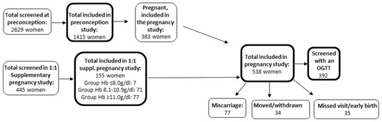 - Hjort, L.; Møller, S.L.; Minja, D.; Msemo, O.; Nielsen, B.B.; Christensen, D.L.; Groop, L. Cohort profile: FOETAL for NCD—Foetal exposure and Epidemiological Transition: The role of Anemia in early Life for Non-Communicable Diseases in later life—A prospective preconception study in rural Tanzania. BMJ Open 2019, 9, e024861. [Google Scholar] [CrossRef] [PubMed]