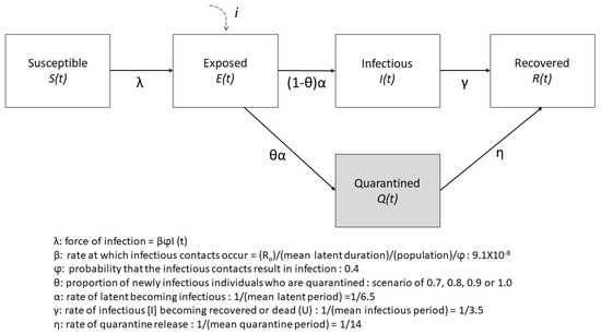 Where the parameters including β, φ, α, γ, θ, and η were the rate at which infectious contact occur, probability that the infectious contact result in successful infection, rate of exposed individuals becoming infectious, rate of infectious individuals becoming recovered, proportion of newly exposed individuals were quarantined, and rate of quarantine release, respectively. The basic reproductive number () and the rate at which infectious contact occur were assumed to be 2.68, and 9.1 × 10−8 based on the , α, φ, and the population size in Seoul (9.74 million) [6,7,8,9]. We assumed the model parameters as: φ = 0.4 [8], α−1 = 6.5 days [7], γ−1 = 3.5 days [10], and η−1 = 0.07. The additional pre-infection seeding (i) as the international students from China would be influx into the exposed class.