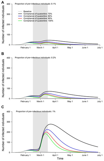 Estimated daily number of individuals with infection in Seoul, South Korea under different scenarios regarding the proportion of pre-infectious individuals: 0.1% (A), 0.2% (B), and 1% (C), based on different compliance rates with home-quarantine (gray: baseline, black: 70%, blue: 80%, red: 90%, green: 100%). Shaded gray bars represent the period of arrival of the international students from China, the country with the risk of 2019 novel coronavirus on February 2020.