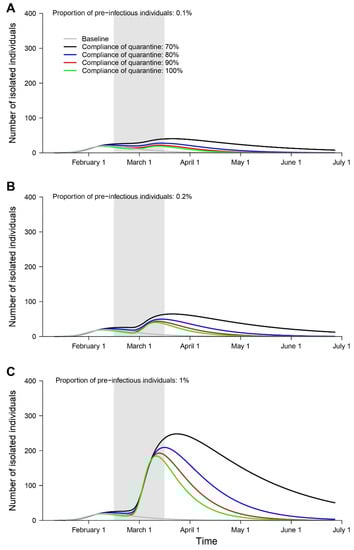 Estimated daily number of isolated individuals in Seoul, South Korea, under different scenarios regarding the proportion of pre-infectious individuals: 0.1% (A), 0.2% (B), or 1% (C) based on different compliance rates with home-quarantine (gray: baseline, black: 70%, blue: 80%, red: 90%, green: 100%). Shaded gray bars represent the period of arrival of the international students from China, the country with the risk of 2019 novel coronavirus on February 2020.
