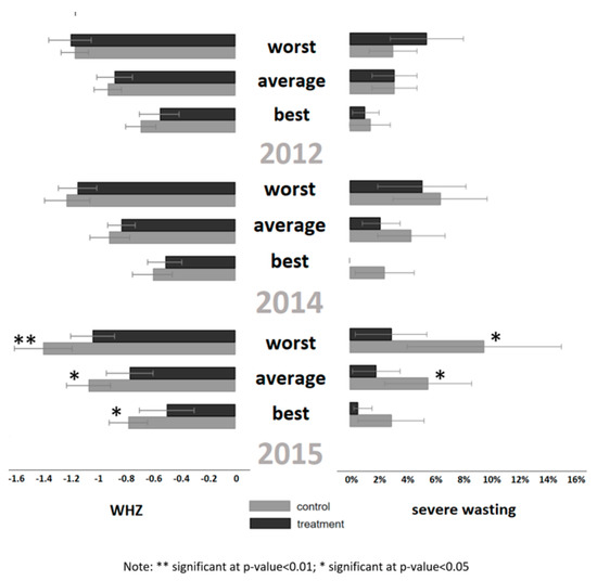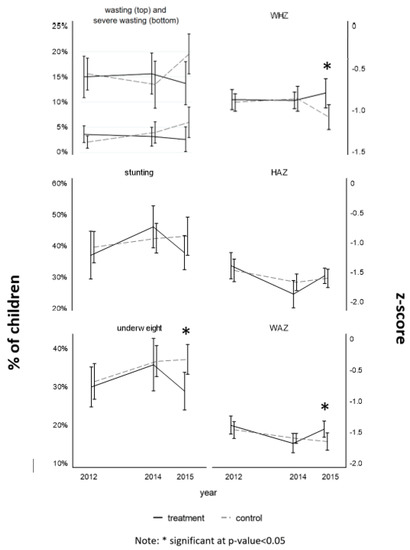 Comparison between children in the treatment and control group at each individual point in time (2012, 2014, and 2015) was done using simple t-tests, controlling for sample design and applying population weights. The comparison was run on the seven outcomes’ variables (Table 1) for all children under the age of five: wasting, severe wasting, WHZ, stunting, HAZ, underweight, and WAZ.