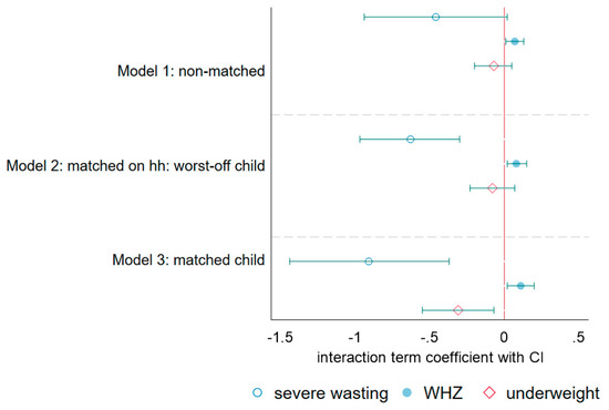 Combining all the models together (Figure 3), we can more clearly compare the results based on each individual type of analysis. Figure 3 illustrates the added benefit of matched child analysis, showing results with a p-value < 0.05 across three of the outcome variables as opposed to two with the matched household analysis and only one with the cross-sectional analysis, despite having less than one-half the sample size.