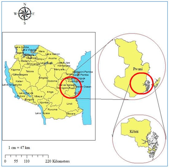 Study site map. Top right is the map of Coast region. Bottom right is the map of Kibiti district. On the left is the map of Tanzania. The study site map was originally generated using ArcGIS software version 10.7.1 (Esri, California, USA; https://www.esri.uconn.edu/software/arcgis-student/).