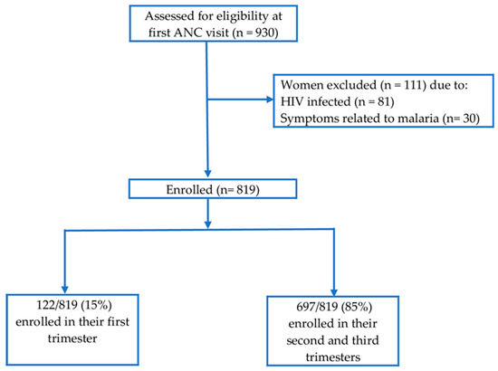 From February 2017 to February 2018, a total of 930 pregnant women attending their first ANC were screened for eligibility and 819 pregnant women were enrolled (Figure 2). The average gestational age at first ANC visit was 5.4 months. Eighty-five percent of enrolled participants started their first ANC visit in their second and third trimesters. Enrolled participants were mainly young adult women aged 20–34 years. About half (51.2%) of enrolled women were pregnant for the third time and above (multigravida). The majority of enrolled women (80.1%) reported to be using insecticide treated bed nets. Socio-demographic and obstetric characteristics of the study participants are summarized in Table 1.