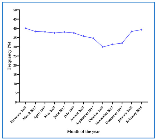 The monthly prevalence of asymptomatic malaria determined by mRDT and real-time PCR at first ANC visit remained above 25% throughout the year (Figure 4) from February 2017 to February 2018, with higher prevalence recorded during the rainy season (February to May)