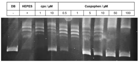 DNA gyrase supercoiling inhibition assay obtained for Cucpxphen as enzymatic inhibitor of the E. coli DNA gyrase, performed with 0.5 μL of relaxed pBR322 plasmid, determined in a 1% (w/v) agarose gel in TAE buffer. DB is dilution buffer and the respective band is the negative control, containing the relaxed plasmid in the absence of the enzyme. Water and HEPES are the positive control bands containing the enzyme and the plasmid. The cpx bands represent the drug control. µM means µmol dm−3 and refers to the concentration of the compound. The experiment was also performed with the S. aureus DNA gyrase supercoiling assay kit (Figure S3 of the Supplementary Material). The enzymatic inhibitory activity of Cucpxphen and Cuspxphen was evaluated for both bacterial species.