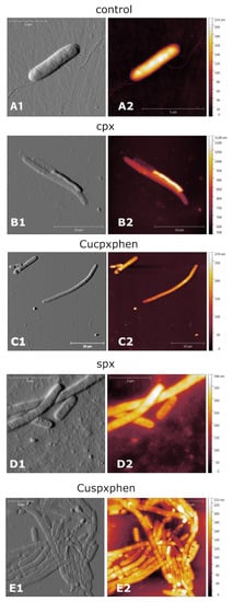 AFM images of E. coli ATCC 25922–control cells (A) and cells treated with cpx (B), Cucpxphen (C), spx (D) and Cuspxphen (E). A1, B1, C1, D1 and E1 are amplitude images; A2, B2, C2, D2 and E2 are height images. These images are representative of the multiple areas from at least three samples analyzed for each condition tested.