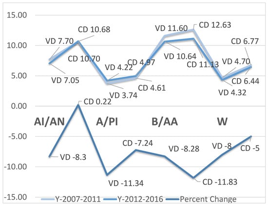 Table 5 exhibits the cumulative infant mortality rates by five-year intervals and the percent change by race and method of labor and delivery. Regardless of race, the cesarean section method of delivery was higher in the first period (2007–2011) of the five-year intervals relative to the second period (2012–2016). The highest rate in the C-section was observed among Black/AA with 12.63 per 1000, while the lowest rate was observed among Asian/Pacific Islanders with 4.61 per 1000. The infant mortality rate slightly lowered in the second period, with the lowest rate observed among Asian/Pacific Islanders despite the slight increase in this period (2007–2011) with 4.97 per 1000. The lowest infant mortality rate in the first period was observed among Asian/Pacific Islanders (3.74 per 1000), while the highest was observed among Black/AA (11.60 per 1000). In these two subpopulations, namely Asian/PI and Black/AA, rates slightly increased in the second period. With respect to percent change, a positive percent change was observed in cesarean delivery (CD) among American Indian/Alaskan Natives, while negative trends were observed in either C-section or vaginal delivery (VD) among other racial groups, indicative of infant mortality overall reduction despite the highest rates among Black/AA and lowest rates among Whites and Asian/Pacific Islander. The trends and the period percent change are indicated in
