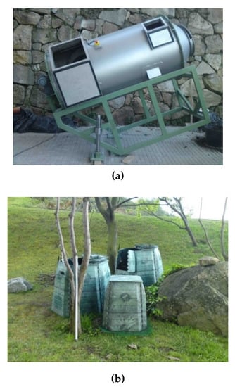 Once the system had been implemented, the personnel in charge of the supervision of the equipment and composting areas dedicated 1 h a week to each composting area. This included students with environmental scholarship, combined later with job placement workers provided by a charitable non-governmental organization. The composting process in static composters has been evaluated as simpler for reduced amounts of organic waste generated by university canteens, up to 15–20 kg/day. In this range of operations, in the following years, new composting areas were installed in which static composters of different volumes were used, which varied from 340 to 1400 L. At the end of 2019, nine composting areas were in operation on the UDC campuses, which treated approximately 80% of the BWUC generated []. For higher generation rates, it was considered convenient to use a mechanical dynamic composter that performs the work of mixing and turning of the material during the first high rate composting phase. The dynamic composter available in the SA facilitated and accelerated the process.
