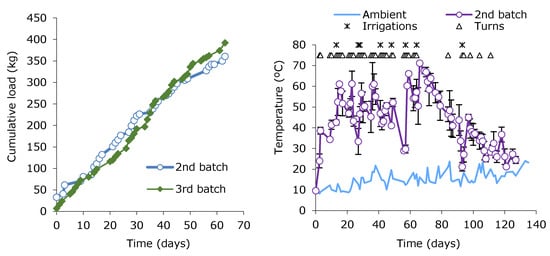 Cumulative loads (BWUC + GrW) on the left and temperature evolution on the right in the Philology Faculty composters. Data corresponds to the second and third batches (loads) and second batch (temperature).