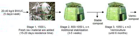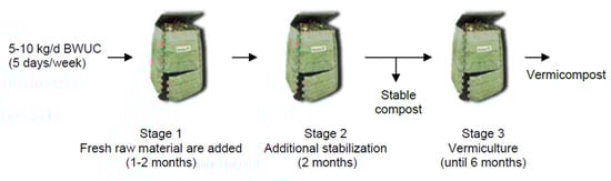 According to these results, a three-stage process was proposed as indicated in Figure 3. The complete stabilization of the compost was verified after stage 2 (Table 3). The process, including the periods of progressive loading and thermophilic composting, requires three to four months to produce stable compost (stages 1 and 2). In this way, stage 3 constitutes an optional stage, in the case of wanting to make vermicompost with the aim of increasing the degree of humification of the material. It may also be considered as an additional maturation stage of interest in the case of sufficient space and if the immediate use of the compost is not necessary.