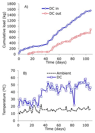Correcting this initial design of the DC1 would require greater capacity and power to its mixer system. Modifications carried out affected the mixing mechanism and the torque of the engine. These changes allowed to reach about 400–500 kg inside the digester. These conditions were applied from the fortieth day of operation forward (Figure 4A,B), reaching an average feeding rate of about 20 kg/day. In these conditions, the material inside the digester reached about 800-900 L of volume, which was a reasonable use of the total reactor volume (about 50–60% of it). The generation of leachate was completely avoided after the first week of this period.