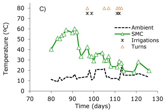 The material taken out from the two reached thermophilic temperatures of 52–59 °C in the SMC for 2–3 weeks (the batch in Figure 4C registered 55.4 ± 3.5 °C on average for 10 days), to approach the ambient temperature after four weeks. Various mixing actions and correction of moisture content were done for at least three weeks without a noticeable increase in temperature (Figure 4C, day 108 onwards). Stable compost of Rottegrade class IV-V was obtained after 3–4 weeks in the SMC when the DC2 is used as the first stage.