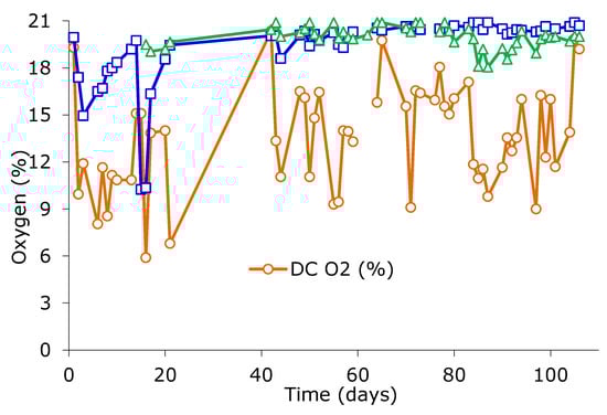 In general, a good oxygenation of the material in composting was observed, both in the DC2 as especially in the SC and SMC (Figure 5). The lowest oxygen values were recorded on a regular basis in the DC2, especially at the low load stage, which showed values in the range of 8% to 17% oxygen, with an average of 11.4 ± 3.3% (n = 15) in the period of low load (days 1–21) and 14.1 ± 3.2% (n = 42) in the period of high load. Static composters showed 19.4 ± 2.2% oxygen on average (n = 56, SC) and 20.0 ± 0.7% (n = 46, SMC).
