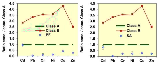 Mean concentration (± S.D.) of heavy metals in the final compost from PF and SA. Concentrations are expressed as values relative to the legal and stricter Spanish limits for Compost Class A, and its comparison with the limits for Class A (relative value = 1) and Class B.