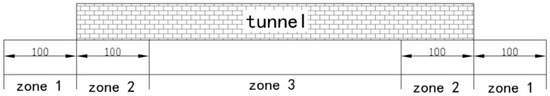 Tunnel zones in this study (Figure 1) are classified into three groups: Zone 1, Zone 2, and Zone 3. Zone 1 and Zone 2 are the transition zones of the tunnel and are defined as the first 100 m in front of the tunnel and the first 100 m into the tunnel, respectively. Zone 3 is the remainder of the tunnel, also known as the interior zone. Tunnels shorter than 200 m have only zones 1 and 2. Figure 2 shows sketch maps of different tunnel zones. Tunnel least horizontal radius and maximum longitudinal gradient are both continuous variables.