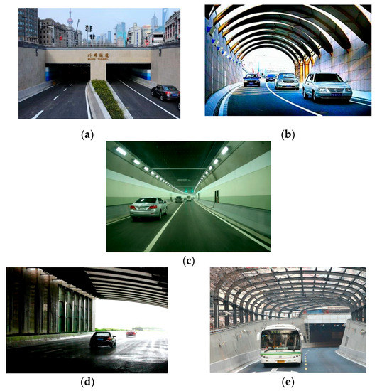 Different Tunnel Zones: (a,e) Zone 1; (b,d) Zone 2; (c) Zone 3. (Data source: Baidu Picture).