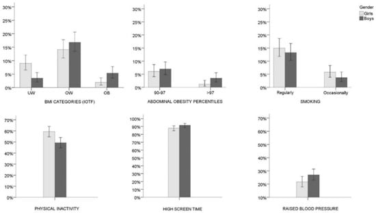 Prevalence of the body mass index (BMI) categories (girls N = 410; boys N = 428), abdominal obesity percentile categories (girls N = 411; boys N = 429), smoking (girls N = 414; boys N = 429), physical inactivity (girls N = 414; boys N = 430), high screen time (girls N = 414; boys N = 429), and raised blood pressure (girls N = 416; boys N = 429) stratified by sex. Error bars represent 95% confidence levels; IOTF = International Obesity Task Force; UW = underweight; OW = overweight; OB = obese. Note: Girls and boys were allocated to the BMI categories according to the IOTF cut-off values proposed by Cole and Lobstein, 2012 [], and to the abdominal obesity categories based on cut-off values of 90th and 97th centiles for German adolescents of respective age between 2003–2007 (Kromeyer-Hauschild et al., 2010 []); physical inactivity refers to <60 min of moderate-to-vigorous physical activity per day; high screen time refers to >120 min of screen related activities per day; Raised blood pressure refers to systolic and/or diastolic blood pressure above the 95th percentile for age, sex, and height as described by Falkner et al., 2001 [].