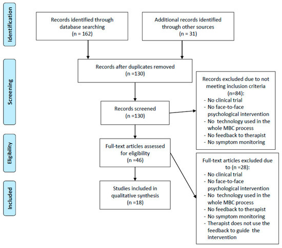 Included studies were psychological treatments enhanced by MBC using technology systems. Specifically, included studies 1. were clinical trials (either feasibility, case studies, and both randomized or non-randomized investigations); 2. included the use of technology during MBC (both for monitoring and feedback provision) while undergoing a face-to-face psychological intervention; and 3. involved feedback to the therapist or to both therapists and patients based on standardized measures.