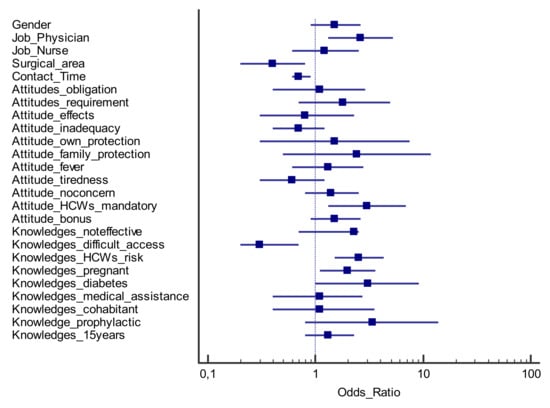 Logistic regression analyses were performed to assess the relationship between the outcome (vaccination carried out in 2018–2019) and variables related to health workers’ attitudes, behaviours, and knowledge. The outcome was established by attributing a value of 1 if the participant underwent vaccination in 2018–2019, and a value of 0 otherwise. Only the variables that were significant in the first phase of univariate analysis were included in the multivariate model.