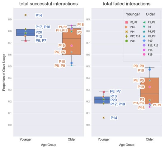 We remotely gathered and analyzed 1600 voice commands from the 14-day experiment. The Mann–Whitney U tests found several significant differences in CA usage: music/audio, lifestyle information, and schedule management. The total number of interactions of older adults was higher than that of the younger group (Table 3). The older adults’ high CA usage may be due to the long time they spent at home. The older group experienced many incomplete interactions, but the proportion of their total failed interactions did not significantly differ from that of the younger adults (Figure 2, Table 3). Therefore, H1 was not supported.
