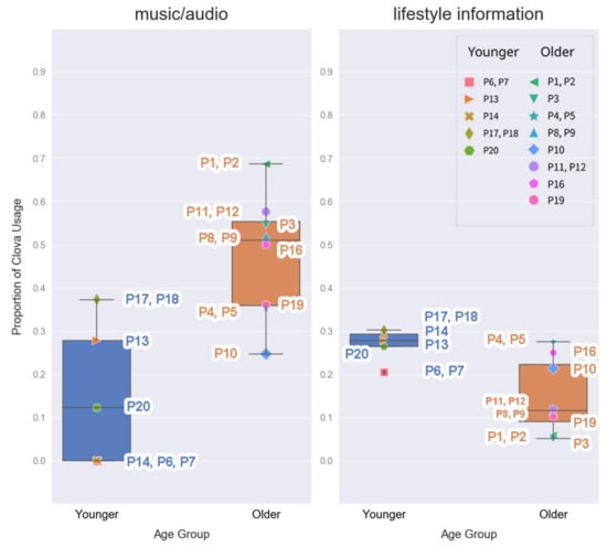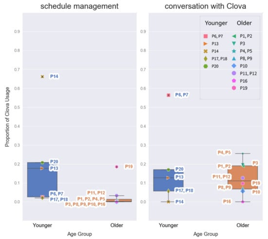 Our study has a few limitations. First, as we have discussed above, CAs are primarily used at home, so their usage could be affected by other activities outside of the home []. All participants in the younger group had full-time jobs, while less than half of the older participants had jobs (n = 5). Thus, the younger adults had less time to use Clova than the participants in the older group, and this might have resulted in the younger adults having fewer interactions with Clova than older adults.
