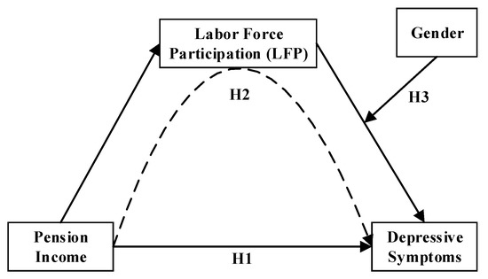 The relationship between public pension and LFP has also been well documented in recent decades [31,32]. Individual wealth carries weight in the decision whether to retire or continue to work. For instance, wealthier people tend to retire earlier [33]. PI can provide a financial incentive for older people to retire [34]. In fact, even though theory may make a clear prediction of the relationship between PI and LFP in older adulthood, it has not always been supported by empirical evidence. For example, Louise Grogan and Fraser Summerfield suggested that PI increased the likelihood that individuals considered themselves pensioners and thus had negative attitudes to ageing and reduced the labor supply in paid work [35]. However, Christopher J. Ruhm argued that old-age pension was likely to reduce labor supply at some ages but to increase it at others, resulting in a more complicated and ambiguous aggregate impact than was frequently realized [31]. Manxiu Ning and colleagues found no evidence that the income from NRPS significantly reduced labor supply among the elderly [15]. To date, however, no study has consistently noted the association between public pension and LFP. Furthermore, the role of LFP as a potential mediator in the link between public pension and depressive symptoms has not been examined.