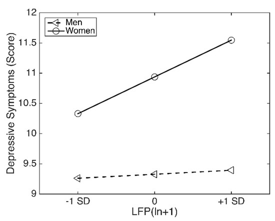 Conditional effect of gender on the association between LFP and depressive symptoms.