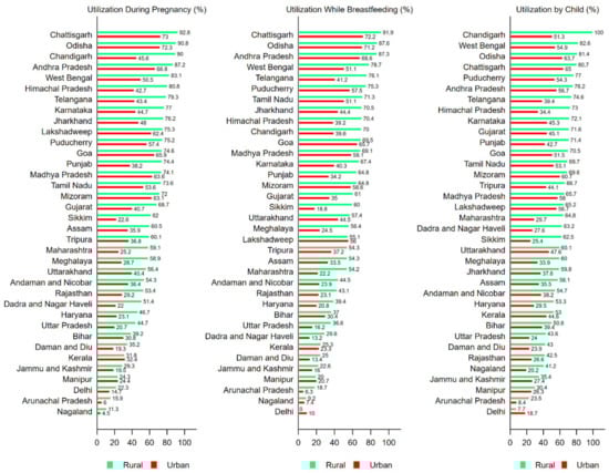 The key to success of ICDS is in finding solutions to the historical challenges of geographic and socioeconomic inequalities in access to various services under this umbrella scheme [,]. For instance, given the social residential segregation, geographical placement of AWCs under ICDS is one of the crucial factors that determine the utilization pattern across socioeconomic groups. Although previous studies have observed little programmatic impact of ICDS benefits on child’s nutritional status [], given its universal design, accompanied by better coordination of multisectoral synergies under POSHAN Abhiyaan, ICDS can potentially bridge these equity gaps in health and nutrition outcomes among children. However, this demands a holistic understanding of the utilization patterns of various services offered under ICDS across rural and urban settings, as well as across broad demographic and socioeconomic groups of beneficiaries (mother and child).