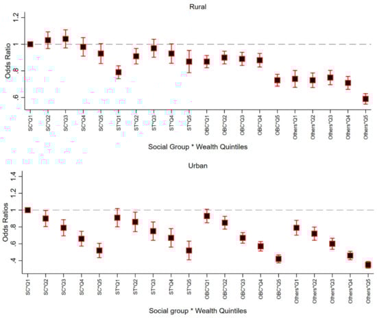 Adjusted odds ratios of service utilization (any) by caste–wealth categories of mothers, stratified by rural-urban location, NFHS, 2016; Note: Odds ratios estimated from a four level (state, district, cluster and individual) logistic regression adjusted for child’s sex, mothers’ age and mother’s education. Q1: lowest wealth quintile; Q2: second wealth quintile; Q3: third wealth quintile; Q4: fourth wealth quintile; Q5: highest wealth quintile; SC: schedule castes; ST: schedule tribes; OBC: other backward class.