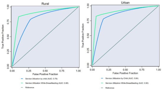 To further confirm the concordance between service utilization at different points (i.e., during pregnancy, while breastfeeding and by children) we also AUC. Discriminatory analysis using AUC based on logistic regression estimates adjusted for age, sex, household wealth quintiles, religion and social group (Figure 4) showed high AUC values for both rural (AUCs < 0.88) and urban (AUCs < 0.90) areas. This indicates a high concordance between service utilization by mothers (during pregnancy) and by child. In other words, the high values of AUCs implies that likelihood of continuum in service utilization is higher if mothers have started receiving benefits during pregnancy. All the estimates are observed to be statistically significant (Table S14).