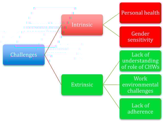 Based on data, two main challenge themes (a) intrinsic factors (e.g., CHWs coping with their own emotional, physical, and psychological challenges and gender sensitivity challenges) and (b) extrinsic factors (e.g., lack of understanding of the CHW role by various stakeholders; environmental challenges: lack of resources in terms of medical supplies, lack of transport; lack of patient and family adherence) emerged (Figure 1).
